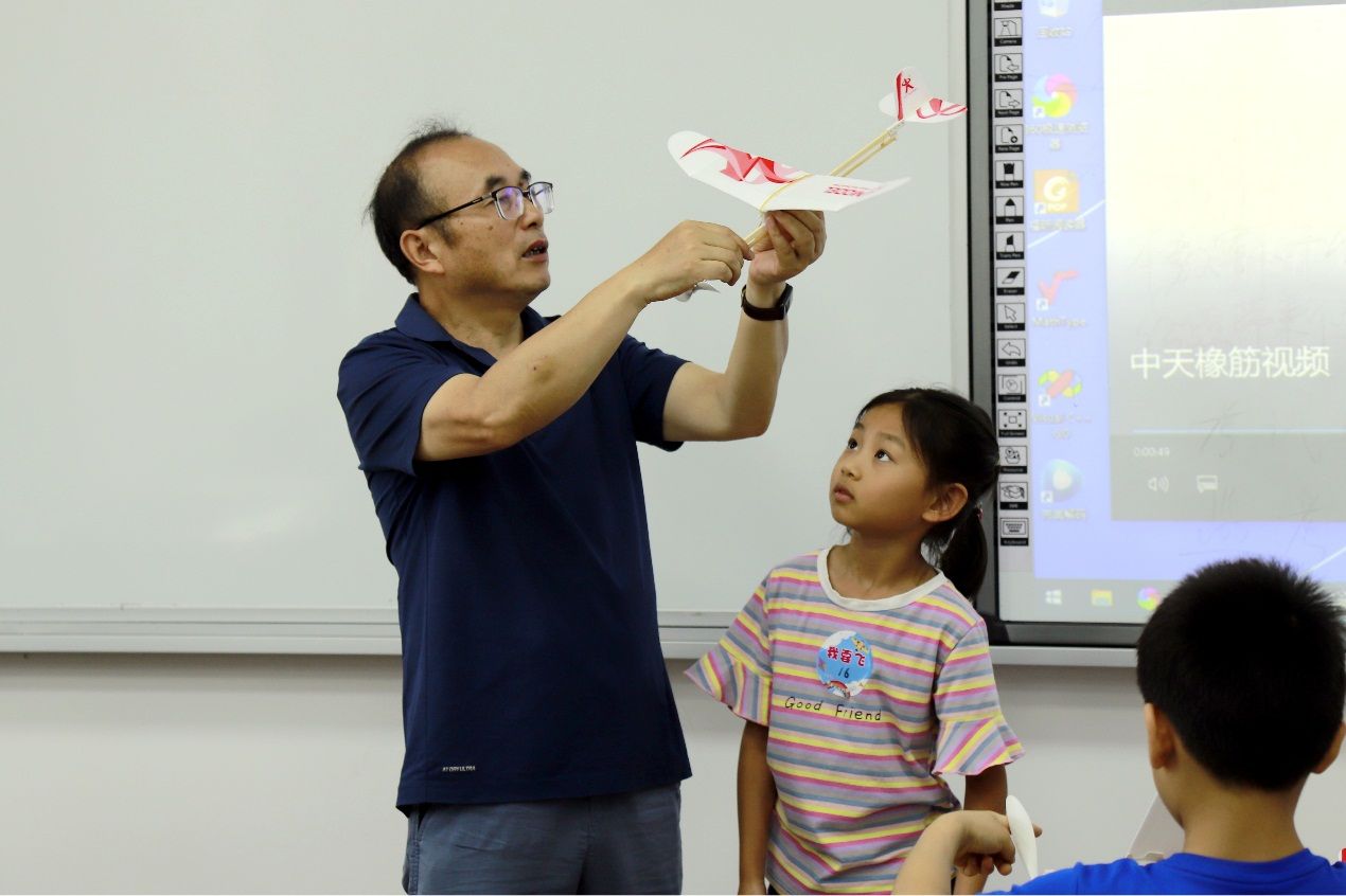 离退休老师商鹏以“翱翔蓝天,梦想起航”的趣味问题点燃孩子们的热情。航模课堂环节,专业导师通过动态演示讲解伯努利原理,孩子们在志愿者指导下完成橡筋动力飞机组装,刘泽琳同学兴奋地表示:“原来机翼的弧度会影响升力!”