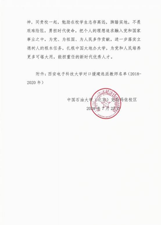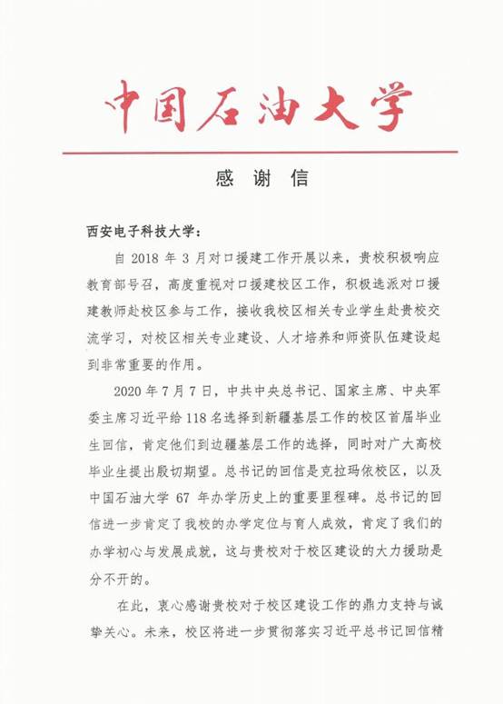 自2018年3月以来,我校牛海军老师、韩宝彬老师相继赴中国石油大学(北京)克拉玛依校区参与对口援建工作,两校在专业建设、人才培养和师资队伍建设方面进行交流学习。为表达对我校鼎力支持与诚挚关心的感谢,中国石油大学(北京)克拉玛依校区特致感谢信一封。