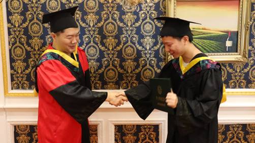下午5时,于海涛在会议室代表学院为4名毕业生代表拨穗、授位,在送上毕业祝福的同时,还给每一名毕业生发放了精心准备的大礼包:一套本科学士服、一件印有XDU的学校文化衫和一把全自动定制晴雨伞。