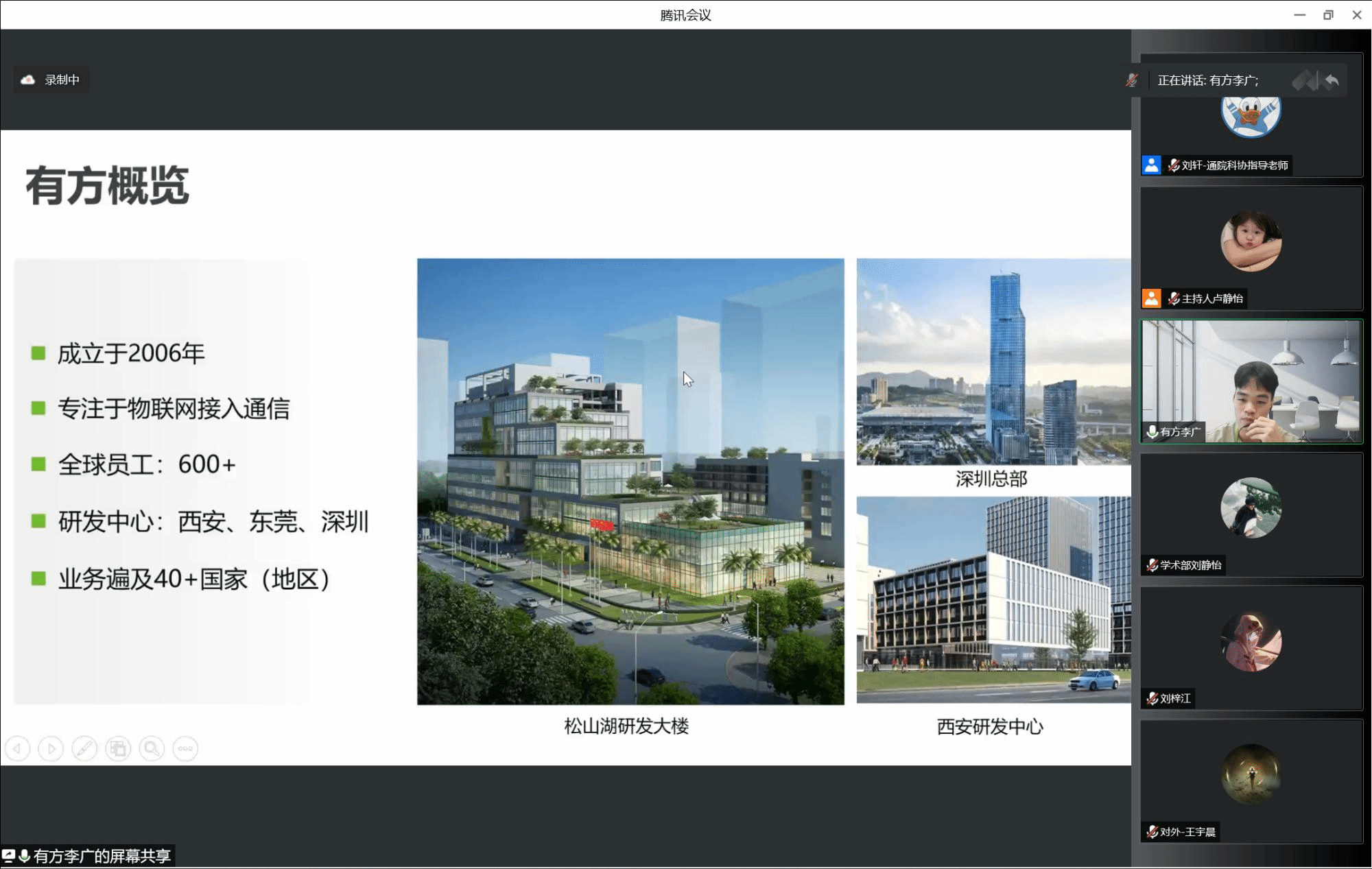 然后,有方科技李广对有方公司和物联网进行了详细介绍,加深大家对有方公司的认识与了解。随后进入参赛经验分享环节。第十届“有方杯”获奖者李艺涵与崔珮珠分别就选题制作、组队分工、设计创新等过程中遇到的困难及应该注意的问题与大家进行了分享。