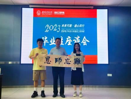 座谈会的最后,毕业生代表向学院赠送了“难忘师恩”书法作品,李云松代表学院接收并与毕业生代表合影留念。珍贵的礼物深情寄托了大家对学院未来发展的美好祝愿,以此感谢在学院求学以来的难忘经历。领导和老师也为同学们再次送上诚挚的祝福,勉励大家在新的舞台上继续追逐青春梦想,实现人生价值,在各行各业发光发热,充分展现“通院人”的底蕴风采。整场座谈会在和睦的气氛中圆满结束。