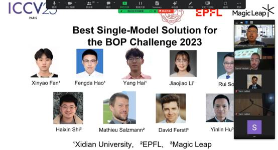 ,洛桑联邦理工学院(EPFL),和Magic Leap组成的联合队伍获得了此次会议举办的BOP Challenge(Benchmark for 6D Object Pose Estimation)中的单模型赛道冠军,同时获邀在8th International Workshop on Recovering 6D Object Pose(R6D)上汇报。