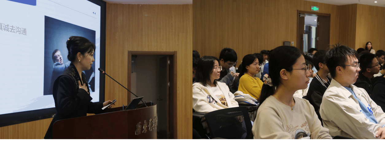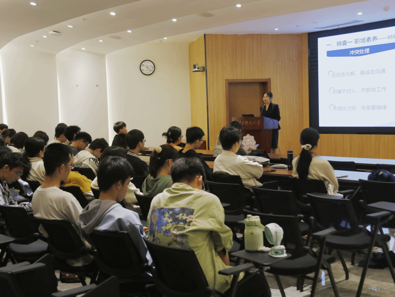 活动伊始,王秋霞与同学们通过一系列小游戏进行破冰,迅速打破陌生感,营造了轻松愉快的氛围。随后,王秋霞以富有感染力的语言,向同学们“倾囊相授”职场素养与基本礼仪。在传授第一个职场素养“锦囊”时,她通过《西游记》五人形象等生动例子,详细解释了时间观念、情绪管理、积极反馈、专注敬业、知行合一等职场素养的重要性和注意细节,指导同学们正确看待和处理人际交往间的冲突问题。学生们认真聆听,并积极参与互动,受益匪浅。在传授第二个基本礼仪“锦囊”时,她借助公司内发生的实例,采用问答互动形式,使同学们身临其境感受到电话礼仪、短信礼仪、汇报礼仪、沟通礼仪等处理细节。